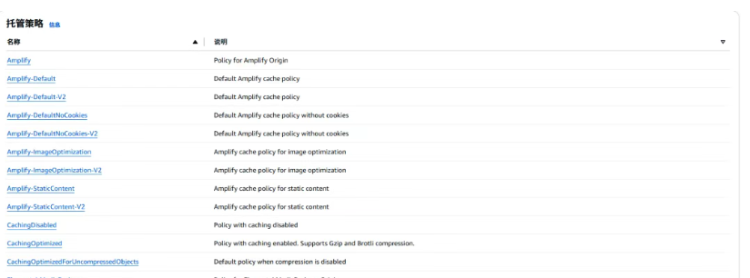 | Amplify-DefaultNoCookies-V2 | 与DefaultNoCookies类似,但有更长的TTL | 与DefaultNoCookies类似 | 追求更高缓存命中率的静态Amplify应用 |